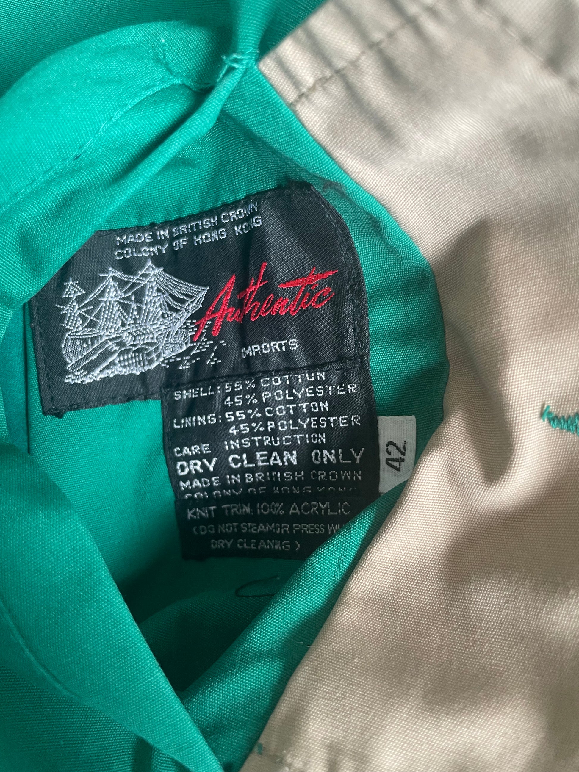 両面ともに配色が最高で上品な印象。個人的には裏面のツートンカラーがドタイプです。サイズ感も幅広い方に合いやすく、香港製でしっかり古いながらもコンディションも良いなおすすめの1着です。